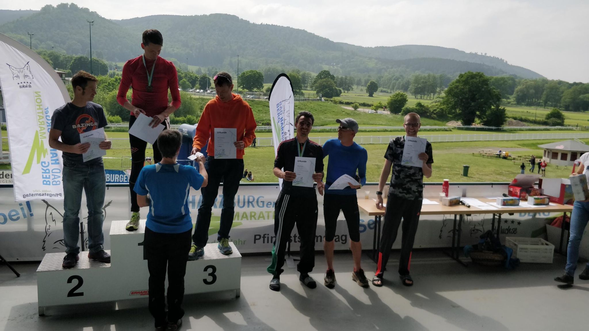 Einen heimischen Wasserloser hab ich kurz vor dem Start noch getroffen, der mir auch seine Prognose für die Höhenmeter gab. 2 Runden gab es zu laufen und ich bin ursprünglich von mind. 350HM pro Runde ausgegangen und war weiterhin gespannt, da ich auf dem ersten Kilometern noch weitere immer unterschiedliche) Einschätzungen einholte. Es waren 18-20 Grad und es war bewölkt, was uns Läufern sehr entgegenkam. Schnell ging es immer höher und nach nach zeriss das Feld und ich fand mich nach 10km mit 2 Halbmarathoni's zusammen, die auf den Ebenen und Bergrunterpassagen mir das Tempo vorgaben und berghoch ich ihnen. Beide waren beeindruckt, dass ich solange mit ihnen mitlief und die letzten 3km Downhill wollten sie mir einreden, dass ich sie nicht weiter begleiten bräuchte. Ich fühlte mich sehr gut und es machte Spass mit den beiden zu laufen und wusste die 2. Runde wird sehr einsam. So war es dann auch. Ich lief diese komplett allein, hatte aber weiterhin viel Kraft diese noch flüssig zu laufen. 1km vor dem Ziel erfuhr ich von den Streckenposten das ich 3. war. Ich war sehr überrascht und erfreut zu gleich und fühlte mich so gut wie noch nie bei Kilometer 43 eines Marathons. ;-) Ein Kilometer mehr und die fast 1000HM waren bezwungen.