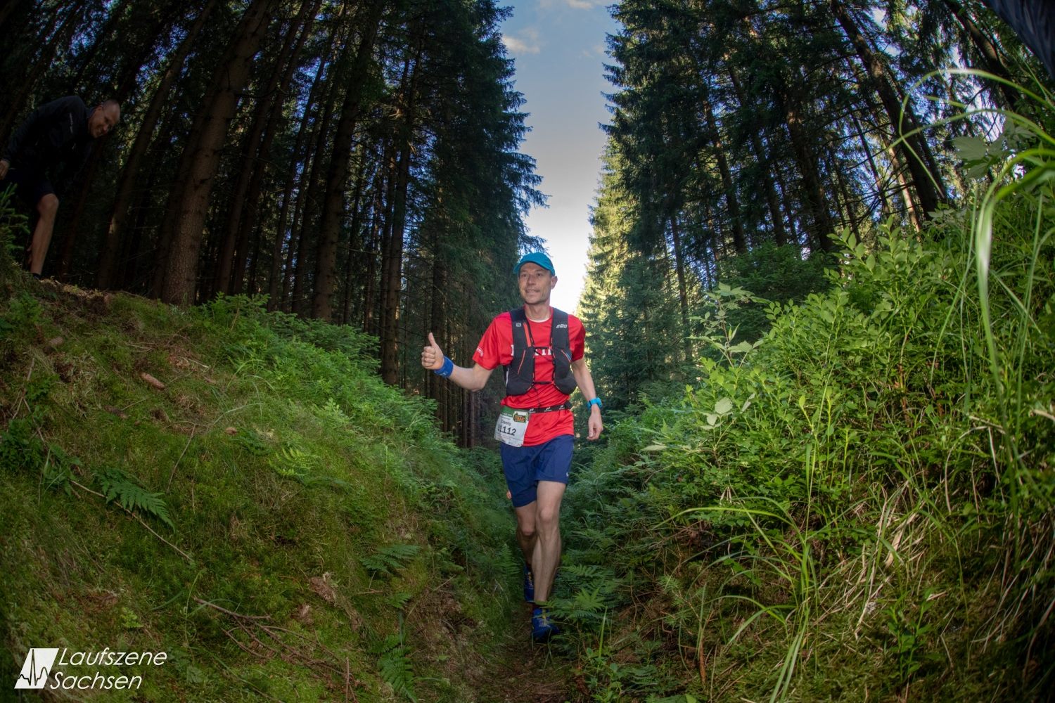 Ich konnte bis 6 Uhr schlafen, hatte genug Zeit zum frisch machen, frühstücken und 5 Minuten vor den Start den Dropbag am Start abzugeben. Dann ging es los. Es war frisch (12-14 Grad) und es sollte nicht wärmer als 20 Grad werden, also perfekte Bedingungen mit Sonnenschein. Da wir schon oben waren, ging es auf den ersten 5km nach unten in einem Mountainbike Trail. Da habe ich schon gehofft dass das nicht die ganze Strecke so weitergeht. Ich bin zwar langsam runterlaufen(und alle im Gänsemarsch hintereinander), aber ich fand es anstrengend, anspruchsvoll und kam schon ins Schwitzen. Wie schon erwähnt bin ich meinen 2 Bekannten vom Vorabend die ersten 20km gefolgt. Ich hatte ein gutes Gefühl, dass das Tempo schnell genug, aber mit Sicherheit nicht zu schnell war. Später machte ich mich dann bergauf davon, konnte einige überholen, die auch bereits gingen. Jedoch einer der beiden schloss wieder auf mich auf und wir sind nochmals 10km zusammengelaufen. Später haben wir uns nur noch bei den Verpflegungsstationen und in den Serpetinen der Mountainbike Trails gesehen. Am Ende war ich 1 Minute vor ihm im Ziel. Ich fühlte mich in den ersten 2/3 ausgezeichnet und hatte genug Kraft im letzten Drittel das Tempo zu halten und bergauf fast immer auch zu laufen. Somit konnte ich noch jede Menge Läufer überholen und am Ende die sogar QuarterTrail Läufer ins Ziel peitschen. Die Strecken war sooooo vielseitig und ich freute mich sogar über reine Asphaltabschnitte. Bei der Hälfte wusste ich schon, heute bekomme ich genug Singletrails, dass es auch mir völlig reicht. ;-) Es gab einfach alles, ausser keinem Fluss zum überqueren. Zum Beispiel einen tollen Grenzpfad, so breit wie ein Fuss und völlig zugewachsen(siehe Bild). Fast ein Drittel ging auch durch Tschechien.