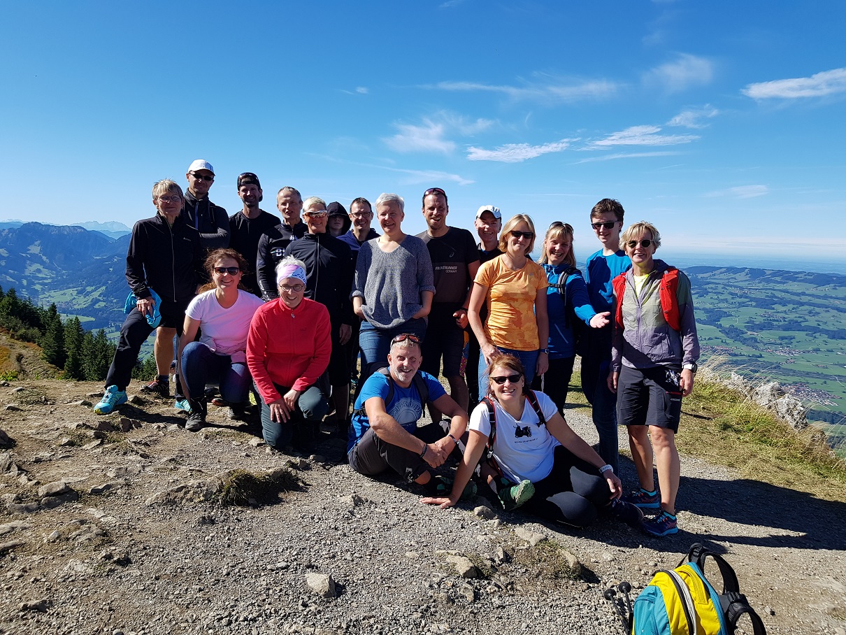 Mit gleich 6 Staffeln nahmen wir erstmalig bei der Grüntenstafette, am 28.09.2019, in der Nähe von Sonthofen teil. Die Grüntenstafette ist nicht irgendein Staffellauf, sondern 6 Teilnehmer pro Staffel, müssen 6 unterschiedliche Disziplinen belegen. Es beginnt mit einem Trailläufer, der ca. 6,4km bergauf und bergab absolvieren muss, bevor er auf den Rennradfahrer übergibt, der bei einem Bergsprint 7,8km mit 355hm überwinden muss. Der dritte Starter läuft dann 3,3km mit 554hm auf den Gipfel des Grünten, wo er das Staffelholz an den Downhill-Läufer übergibt, der sich 2,1km und 455hm wieder den Berg hinabstürzt. Am Ende des Downhills wartet der Mountainbiker, der mit 12km den längsten Abschnitt zu bewältigen hat, hierbei aber neben 540hm bergab auch 100hm wieder bergauf fahren darf. Zum Schluss sprintet der Straßenläufer die letzten 5km bis ins Ziel. Über 250 Staffeln stellten sich den Herausforderungen und es waren, neben uns Breitensportlern, auch Kaderathleten auf den verschiedenen Disziplinen am Start. Wir hatten unsere Staffeln so aufgeteilt, dass jede Staffel ein Gesamtalter von über 250 Jahren hatte. Unsere jüngsten Teilnehmer waren Marlene Gerlach und Yannik Klein mit 23 Jahren. Erika Freund (79 Jahre), Ingrid Perkampus (78 Jahre) und Peter Hümpfner (74 Jahre) waren die ältesten Teilnehmer der gesamten Veranstaltung.