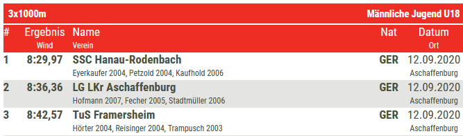 Das kann sich sehen lassen! Bei unserem zum ersten Mal durchgeführten Herbstsportfest mit Langstaffeln wurde durch die Staffel des SSC Hanau-Rodenbach die Deutsche Jahresbestleistung erreicht. Mit der Zeit von 7:48,30 Minuten waren Jakob Thöming, Julius Hild und Marius Abele fast 10 Sekunden schneller als die zweitebeste Staffel in Deutschland in diesem Jahr. Auch die anderen bei uns gestarteten Staffeln liegen auf Spitzenplätzen - die zweite Mannschaft des SSC Hanau-Rodenbach auf Rang 6, das Team von der LG Landkreis Aschaffenburg auf Rang 8 und die vom TuS Frammersheim auf Rang 11. Diese drei Mannschaften sind noch Jugendliche und auch dort super platziert - im der U20 belegen sie die Plätze 3, 5 und 7 und in der U18 gar die ersten drei! Die LG Staffel ist zudem in der U16 auf Rang 1.