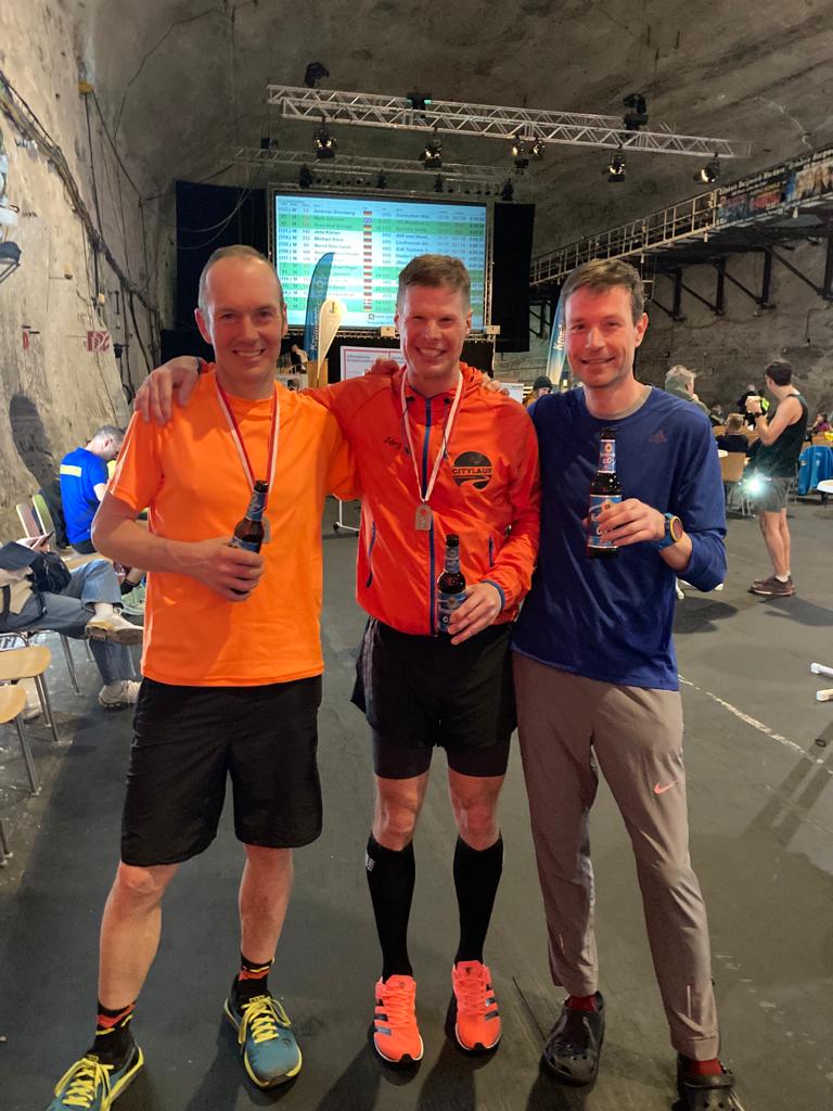 Am Veranstaltungstag freute sich die Fahrgemeinschaft auf der Anreise sehr auf das bevorstehende Event, da diese Veranstaltung unter eingefleischten Läufern ein absolutes Highlight darstellt. Bei Minustemperaturen und leichtem Schneefall trafen die LuTér rechtzeitige am K+S Bergwerk ein. Schnell die letzten Vorbereitungen treffen und die Pflichtausrüstung Helm & Stirnlampe anlegen, schon befördert der Fahrstuhl die Läufer-Sardinen in eine Tiefe von 500 Meter unter Tage. Hier brachten safariartigen Transporter die Läufer an den Start. Erfahrene Kumpel saßen hier am Steuer beförderten mit Achterbahnfeeling Läufergemeinde. Sogleich bekam man bereits hier schon mal einen kleinen Vorgeschmack auf das, was Besucher im Salz- und Kaligesteinstollen zu erwarten hatten. Bei im Schnitt ganzjährlich angenehmen 21 Grand unter Tage, bereiteten sich die Läufer und Besucher auf die jeweiligen 10km, 21km und 42,195km Starts vor. Dort wo schon Howard Carpendale, Udo Jürgens, Purple Schulz und viele andere Stars die Untertageakustik nutzten, standen nun auch die 15. Kristallmarathon-Läufer-Gemeinschaft, um Erfolg zu haben. Weniger ist mehr, und so fiel schließlich der Startschuss für die sommerlich gekleideten Starterinnen und Starter. Sogleich schnellte der Läufer durch den Stollendom, am Schaufelradbagger vorbei in das Höhlensystem. Eine Streckenmarkierung ist Untertage obsolet, denn nur die beleuchteten Röhren sichern ein verlässliches Fortkommen unter Tage. Wie Glühwürmchen hechelte die Läufergemeinschaft durch die Stollensysteme auf ihren Rundkurs mit ca. 3,2km Länge. Mit jedem Schritt gibt so das Stollensystem dem Läufer eine stetig wandelnde Untertagewelt wieder. Leucht- und Schattierungseffekte, beleuchtete Discokugeln und Musik von der Soundbar motivieren jeden. Verpflegt und angefeuert vom Veranstalterteam und von vielen Untertagekumpels in ihrer Arbeitskleidung, eröffnet jede weitere Stollenrunde dem Läufer neue Anreize, die insgesamt 13 Runden durchzuhalten. Entgegen gleichgelagerter Übertageveranstaltungen weckt die saline Luft bei jedem Teilnehmer ein gesteigertes Verlangen nach Flüssigkeitsaufnahme. Diese wurde jedoch in ausreichendem Maße von den zahlreichen Helfern an den jeweils streckenhälftigen Verpflegungsstationen befriedigt. So verging Runde um Runde und in Summe kommt der Untertagemarathonläufer so auf insgesamt ca. 750 sportliche Höhenmeter. Natürlich meisterten dies Thomas, Danny & Jörg als erfahrene Ultraläufer vorbildlich. Mit einem sehr guten Gesamtergebnis wurde der Danny Sternkopf final mit einer Zielzeit von 03:07:49 h 3. Gesamtsieger. Somit steht er aktuell auf Platz 18 und in der AK auf Platz 3 der Marathon-Bestenliste Deutschland für 2023. Thomas Elsesser krönte seinen Saisonauftakt mit 03:50:53 h und kam so in der Gesamtwertung auf Platz 60, während Jörg Fleckenstein den Jahresauftakt ein wenig geschmeidiger angehen lies und mit 03:54:54 h bzw. Platz 76 in der Gesamtwertung von im Ziel 181 Zieleinläufern finishte. Gut gelaunt und mit einer „merkischen Brühwurst“ im Bauch, traten die Drei wieder ihre Heimreise an. In der Rückschau war dies eine gelungene, gut organisierte Veranstaltung mit besonderem Reiz für Läufer, gerne kommen wir wieder, Danke & Glück auf Merkers!!!