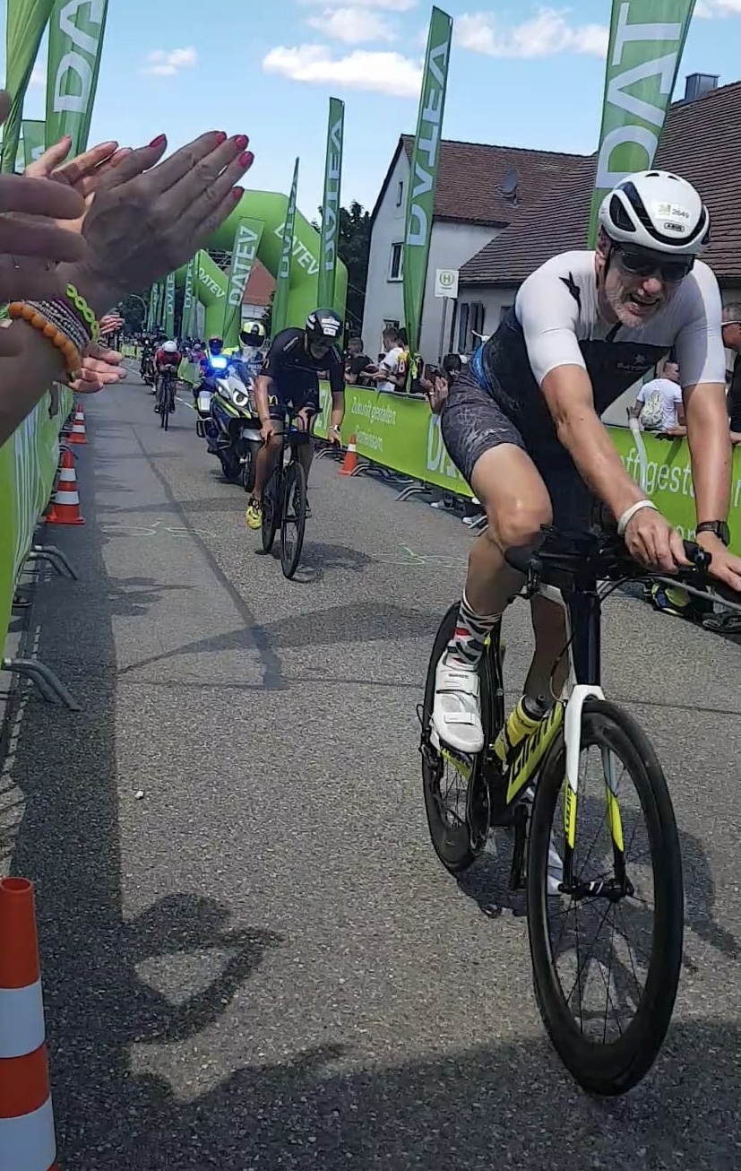 Nach einem für meine Verhältnisse sehr ordentlichen Schwimmen im Main-Donau-Kanal ging es dann auf den Radkurs über zwei Runden à 90 km. Dort lief es auch überraschend gut. Die Zuschauer, vor allem am berühmten Solarer Berg, gaben zusätzliche Motivation. Darunter waren auch einige LuT‘ler: vielen Dank für’s anfeuern! Auf dem Rad kam es dann auch zum Aufeinandertreffen mit Frodeno und Co.: immerhin hatte ich es ein ganzes Stück in die erste Runde geschafft, bis ich überrundet wurde. Vom Rad ging es dann auf den Marathon, der bei über 30° ziemlich anstrengend wurde. Umso mehr war ich letztlich mit dem Ergebnis zufrieden.
